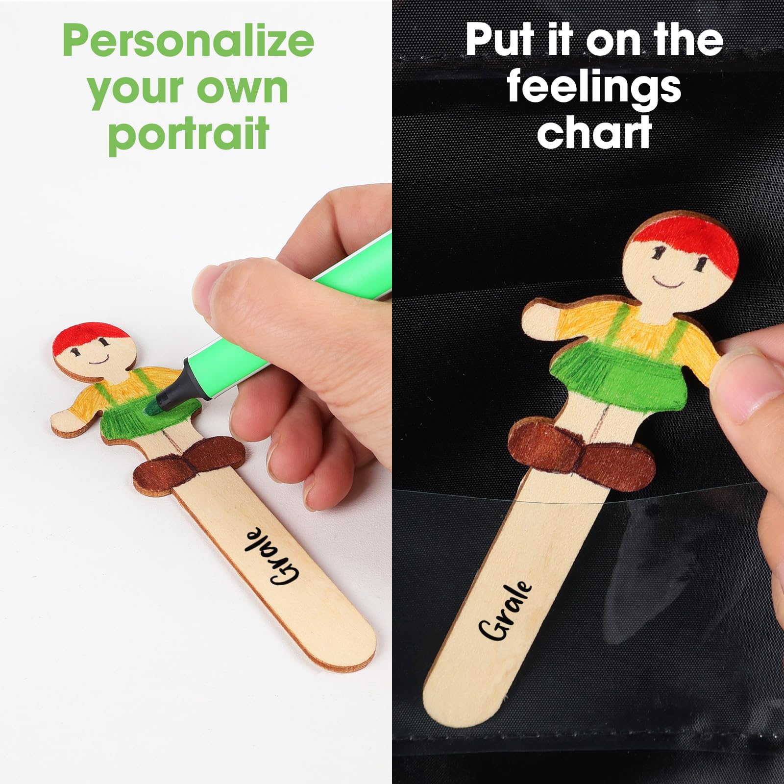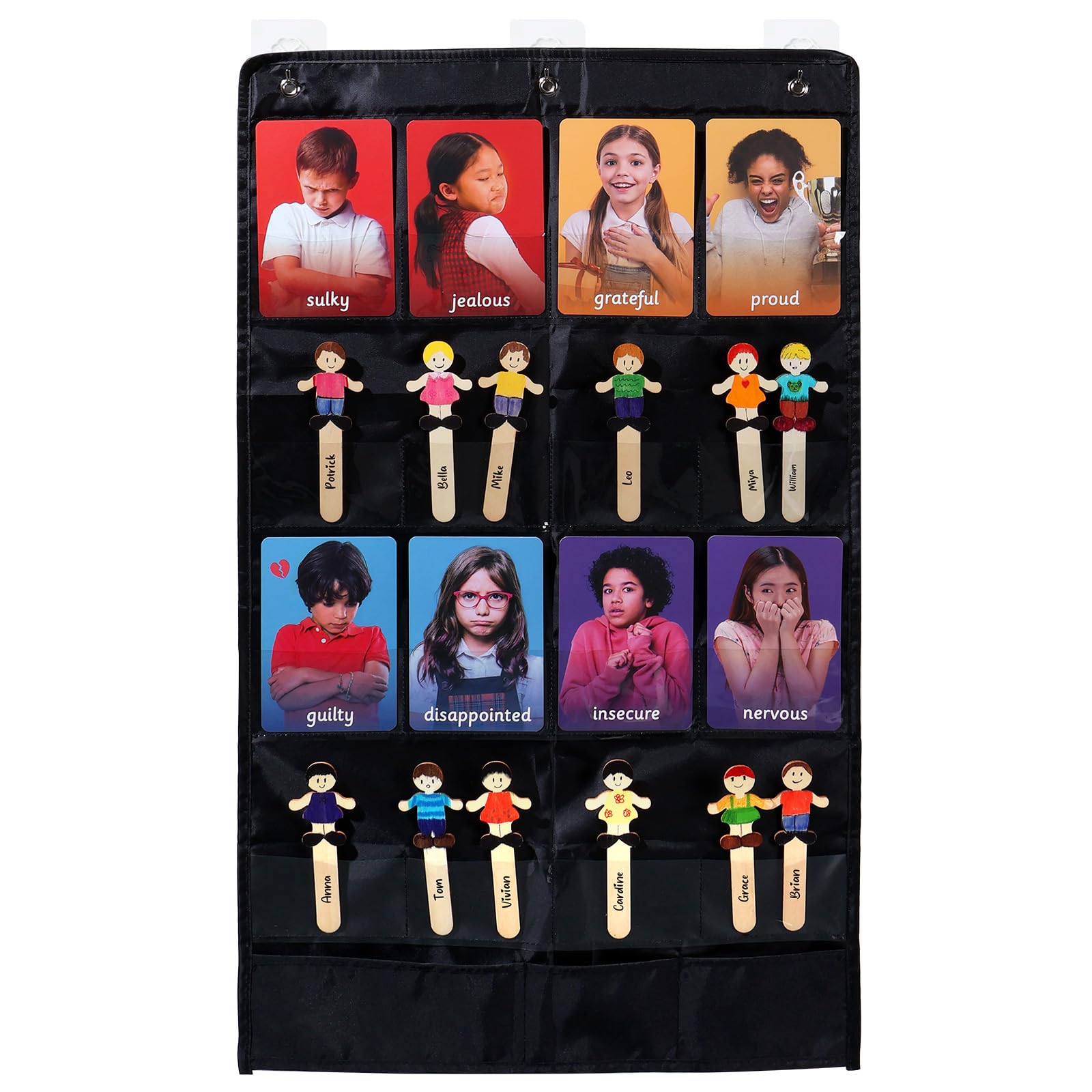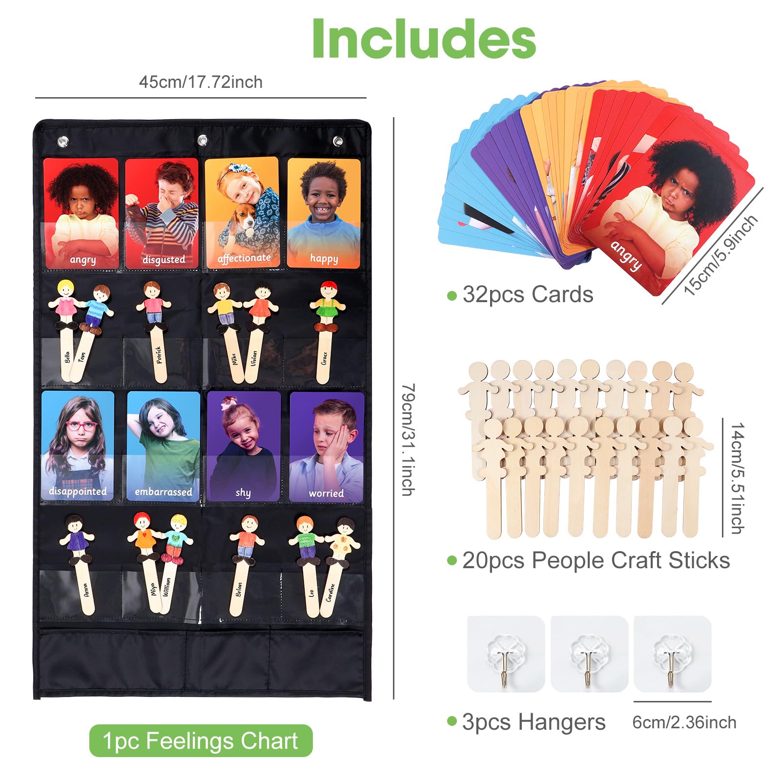 - SPEECH THERAPY TOYS: Our visual fellings picture cards can help kids with need of speech therapy, it includes1 feelings chart with 15 pockets, 24 double-sided emotion cards for kids, 20 small wooden chips, and 3 hooks.
